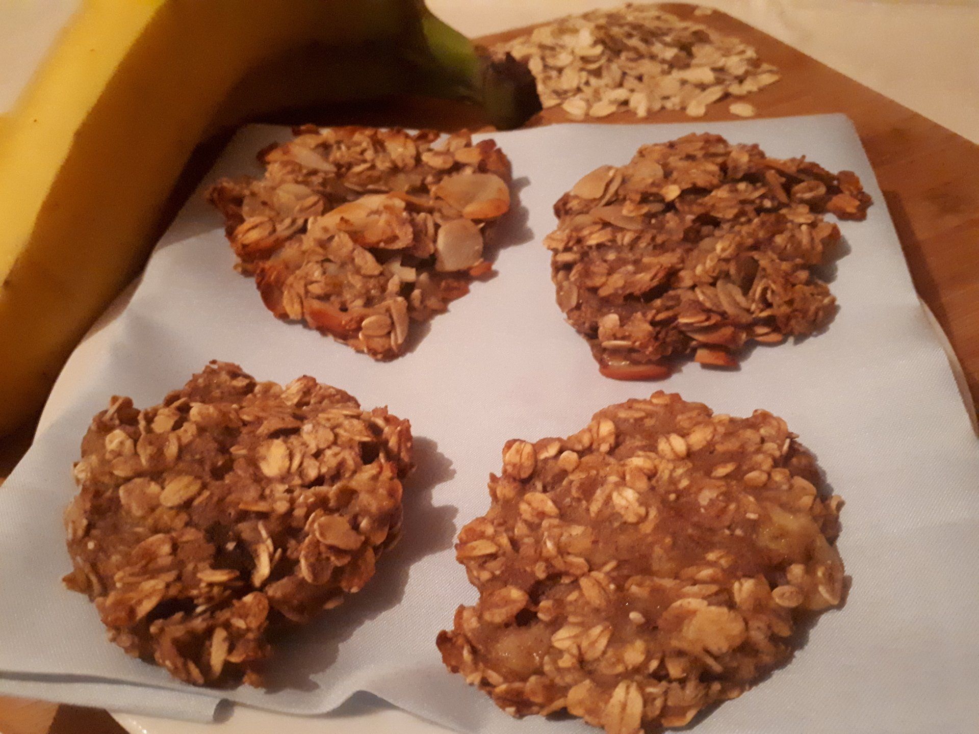 Die Bananen werden kleingeschnitten und mit einer Gabel zerdrückt. Dann mischt man nur noch die Haferflocken unter und gibt mit einem Löffel Kleckse auf ein mit Backpapier ausgelegtem Blech. Nach 20 Minuten bei 160 °C (Umluft) backen, sind die Plätzchen schon fertig.